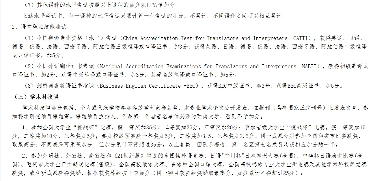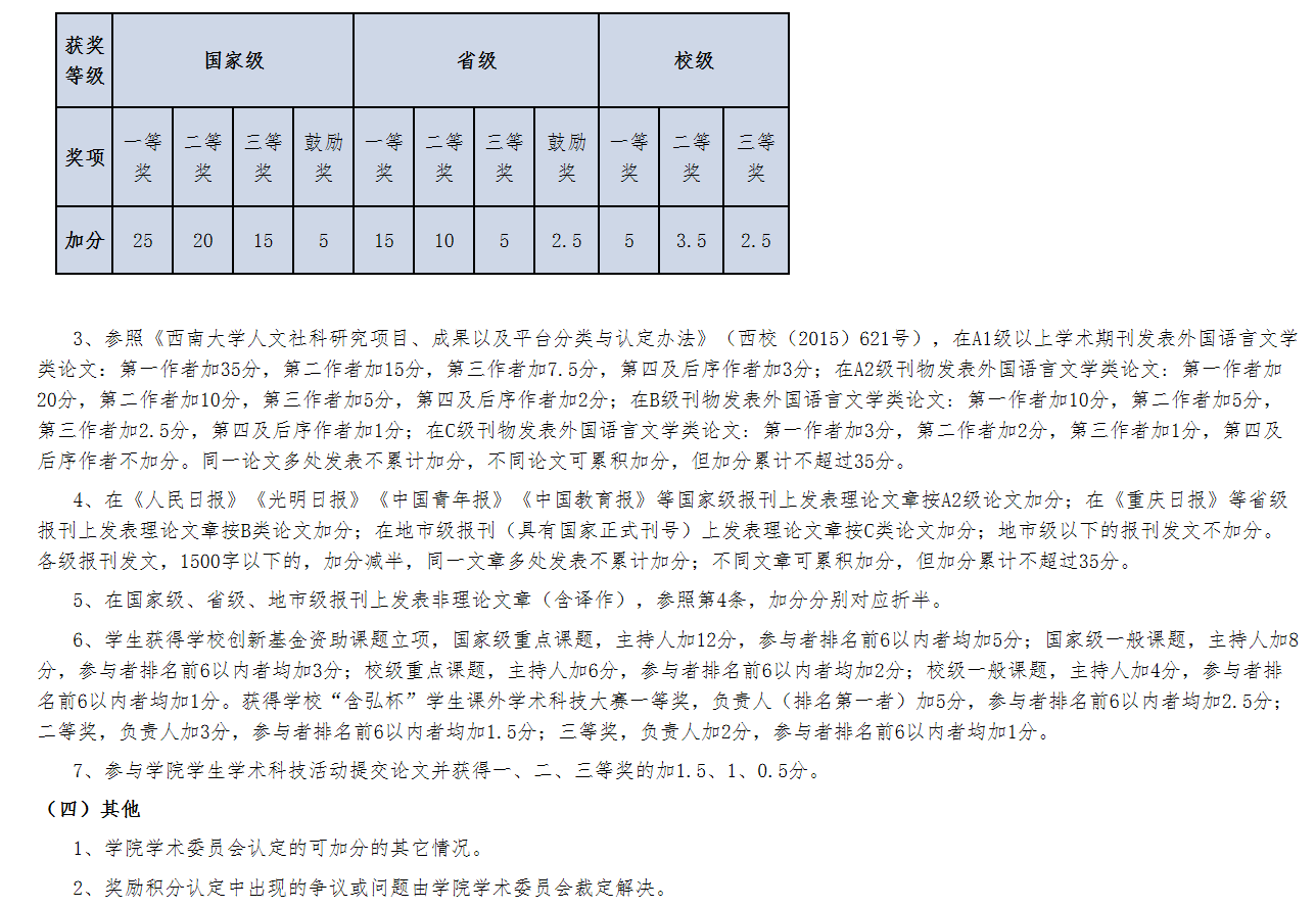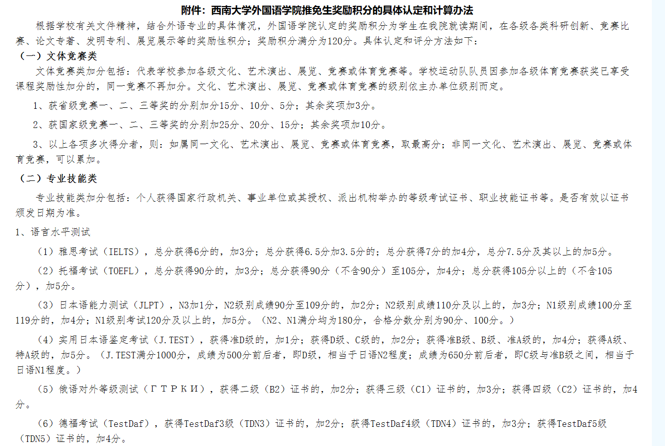 成绩积分为学科基础课、专业发展必修课和实践环节课的加权平均分(课程成绩均为百分制且不计重修成绩,成绩积分=∑参加计算的课程成绩*学分/∑学分);奖励积分为各级各类科研创新、竞赛比赛、展览展示等的奖励性积分,其具体认定和计算办法见附件:《西南大学外国语学院推免生奖励积分的具体认定和计算办法》。奖励积分总分满分为120分,转换成百分制后进入综合积分计算。