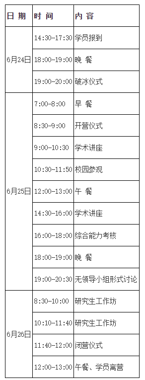2023年夏令营活动以线下形式举办,时间暂定于6月24 日-26日,为期3天。初步日程安排如下: