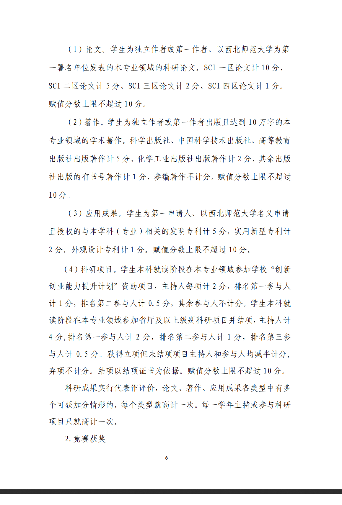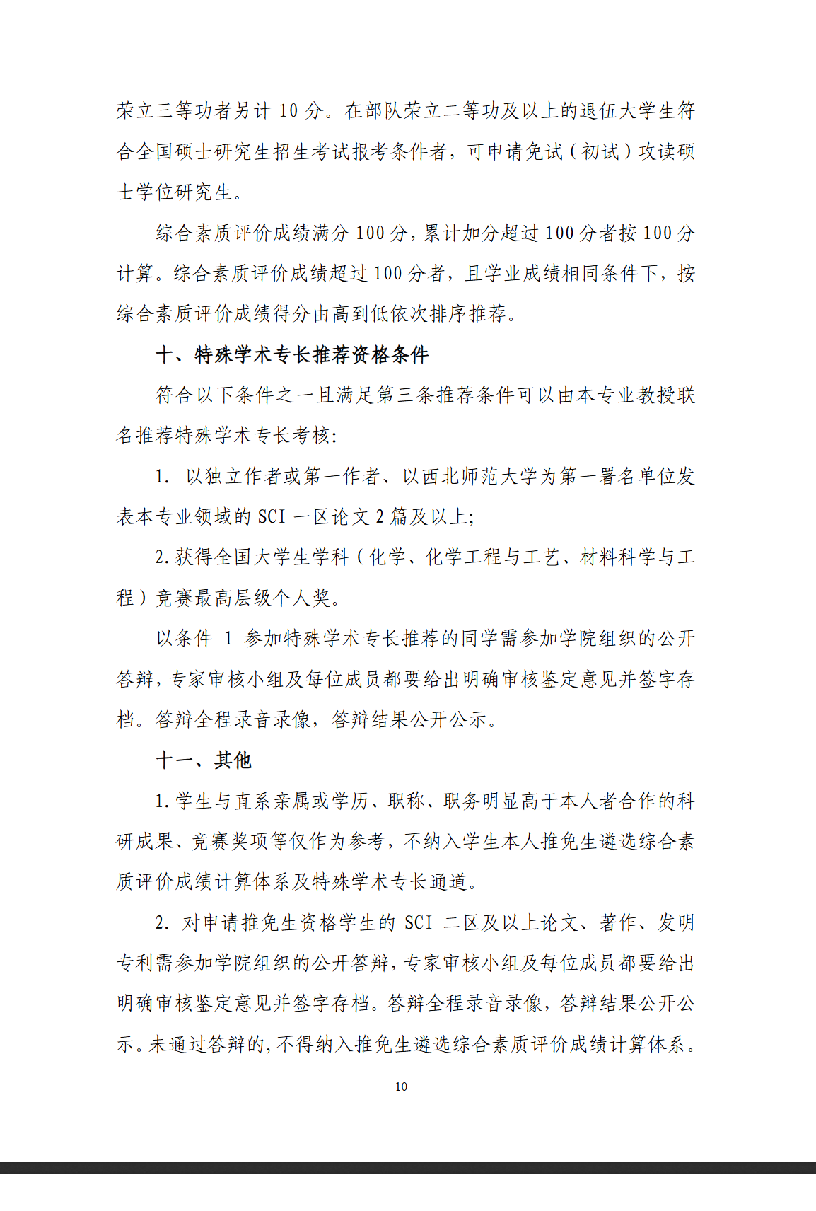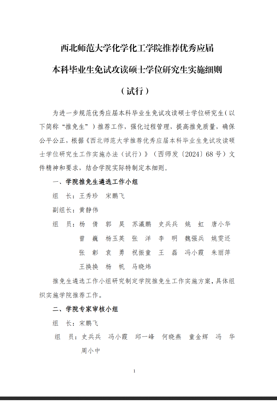 西北师范大学化学化工学院推荐优秀应届本科毕业生免试攻读硕士学位研究生实施细则