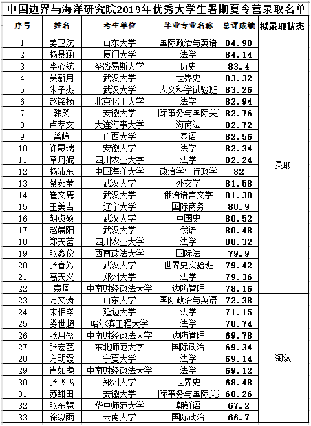 中国边界与海洋研究院2019年优秀大学生暑期夏令营拟录取名单
