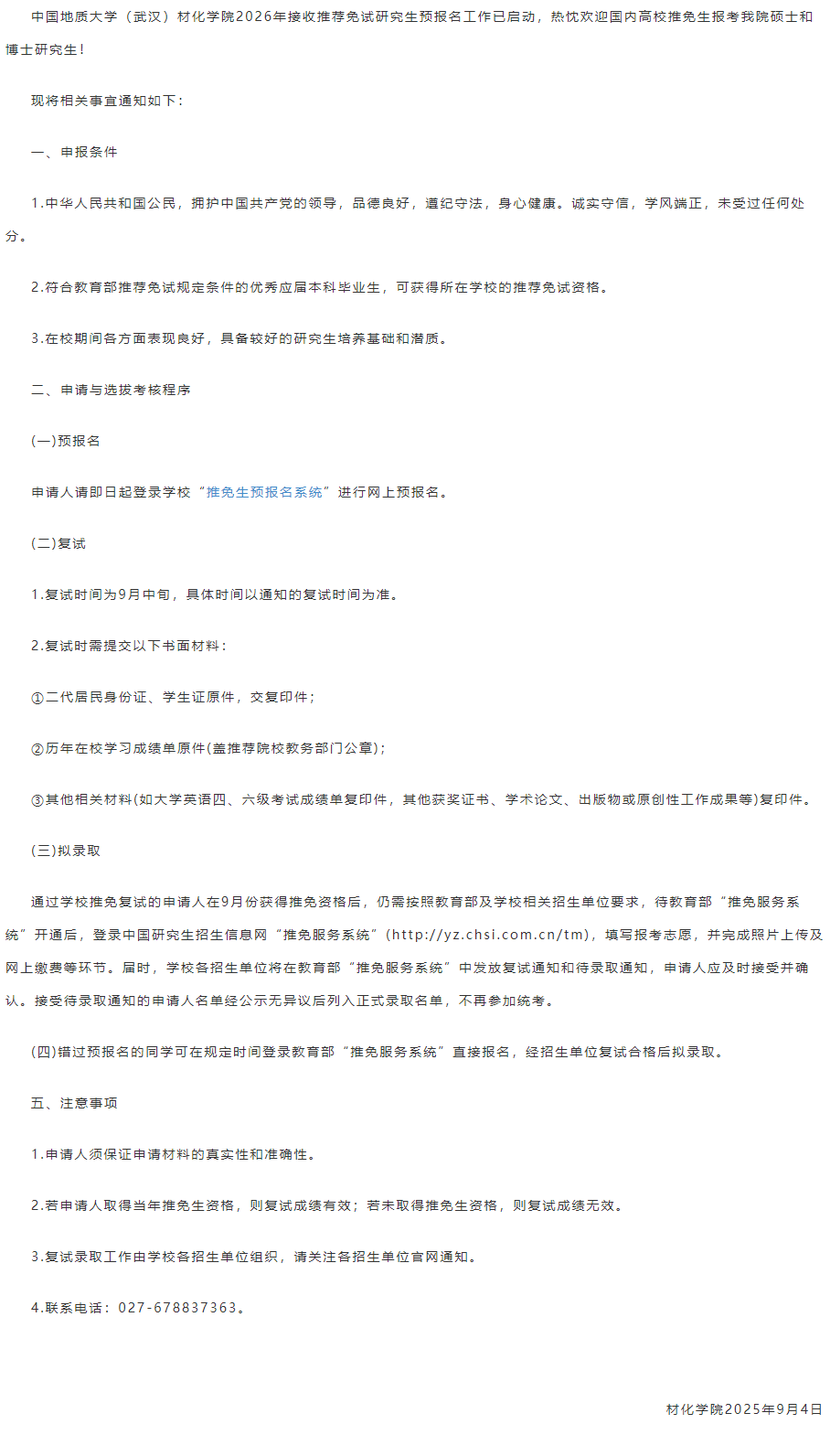 材化学院2026年接收推免生预报名通知