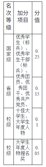 2.学生党建群团工作所获荣誉评价加分。在校学习期间,获得各级奖励或荣誉称号者参考表2分值,同一类型奖项按最高级加分,不累计加分。
