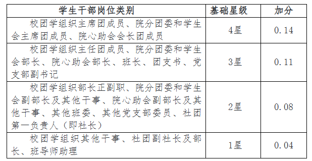 5.担任学生干部者,按下表加分。基础星级对应前三学年的最高学生干部岗位。前三学年连续担任学生干部者,在基础星级上每多一学年加一星,加0.03分,最多加两学年。除班干部之外,需要提供学生干部聘书或任职证明(经主管老师签字、盖章)。
