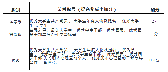7.在校学习期间获荣誉称号参考下表加分(荣誉称号需经法学院推免生资 格工作组认定)。 本项加分总分不超过2分;获2项校级荣誉称号加0.5 分,累 计不超过0.5分;同一事由(荣誉称号)加分不叠加,取最高奖励或荣誉称号加 分,最高不超过2分。