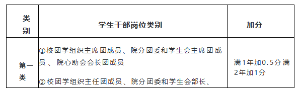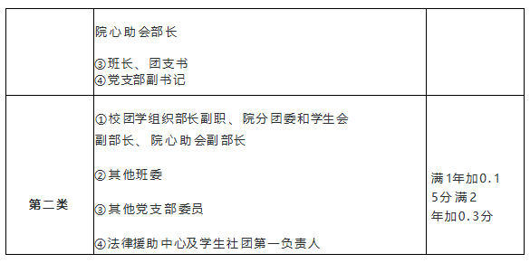 8.担任学生干部加分参考下表, 选取最高职务项加分(学生任职情况需经 法学院推免生资格工作组认定,且任职时间需满一学年),同一学年学生干部 加分不累加,取最高项加分,最高不超过1分。