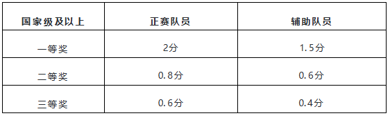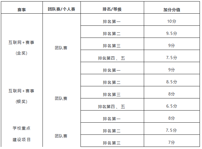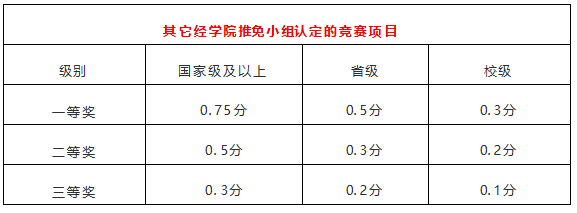 4.在学院认可的其他学科、科技、文艺、体育竞赛及学院推免小组认定的 其他赛事等中获奖者,按下表加分;团队获奖的,减半加分。