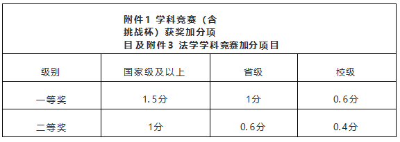 3.在学校认定的《学科竞赛(含“挑战杯 ”)获奖加分项目》 (见附1)和学 院推免小组认定的《法学学科竞赛获奖加分项目》(见附3)中获奖者,按下 表加分;团队获奖的,减半加分 (国家级或 省级挑战杯获奖不减半)。 同一参 赛项目如有多项加分,只取最高分。本项加分总分不超过2分,加分对象以证 书上所载姓名为依据。