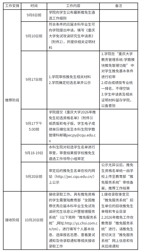 根据教育部2026年推免工作会议精神,按照《全国普通高等学校推荐优秀应届本科毕业生免试攻读硕士学位研究生工作管理办法(试行)》(教学〔2006〕14号)、《教育部办公厅关于进一步规范和加强推荐优秀应届本科毕业生免试攻读研究生工作的通知》(教学厅〔2020〕12号)以及《重庆大学推荐优秀应届本科毕业生免试攻读研究生工作管理办法》(重大校发〔2021〕63号),经重庆大学推免生遴选工作领导小组研究决定,我校2026年推荐优秀应届本科毕业生免试攻读研究生工作即日正式启动。现将有关事宜通知如下: