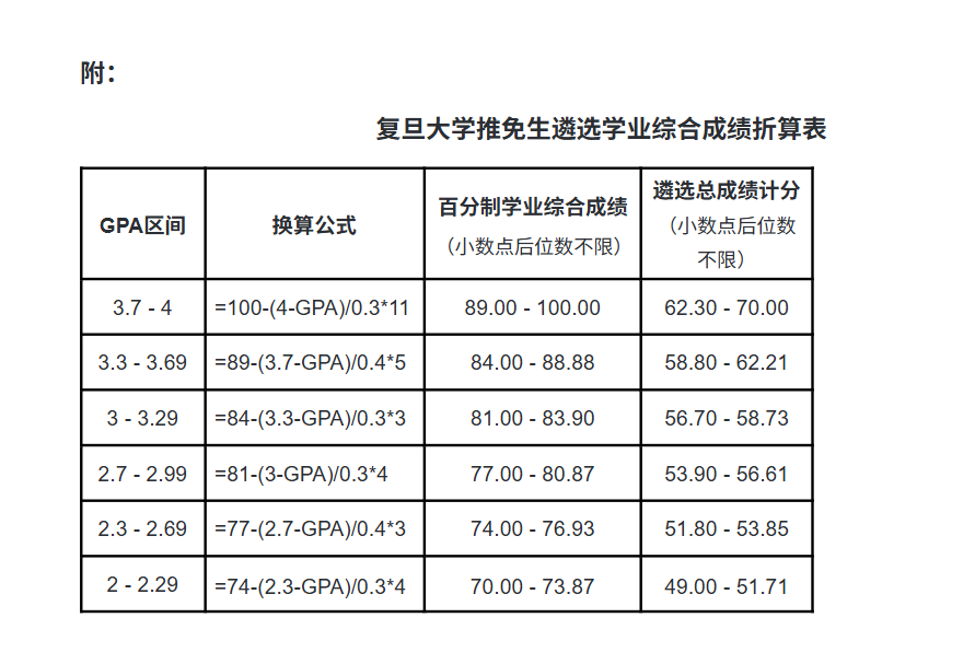 2.强化对学生本科阶段的全过程评价,重视对学生一贯学业表现的考察。申请人所有已修大类基础课程、专业必修课程无不及格成绩。符合要求的申请人,以本科阶段所有已修课程的平均绩点作为其学业综合成绩,先按《复旦大学推免生遴选学业综合成绩折算表》折算为百分制学业综合成绩,再按70%权重计入遴选总成绩(百分制)。为持续稳步推进学业评价体系改革,在推免系统中的实际绩点之外,按旧政策计算的绩点排名将作为参考,具体方法根据学校指导意见执行。