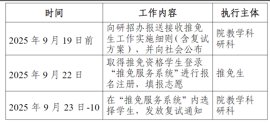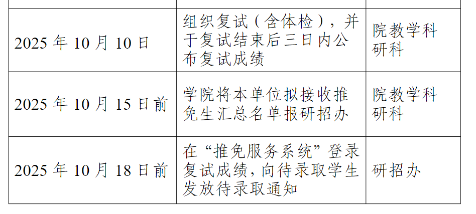 第3页共6页(五)品行表现优良,无任何违法违纪受处分记录。(六)身体健康状况符合国家体检及我校相关要求五、工作程序(一)取得推免生资格的学生可于2025年9月22日9:00起登陆“全国推荐免试攻读研究生(免初试、转段)信息公开暨管理服务系统”(网址:https://yz.chsi.com.cn/tm),按规定进行报名、缴费。(二)学院组织相关人员在“推免服务系统”中对申请我院的推免生进行择优遴选,向符合条件的学生发放复试通知书,学生应按相关要求及时回复确认。(三)取得我院复试通知的学生持以下考生材料参加复试:51.本人学生证、身份证原件及复印件。2.在校期间学业成绩证明原件(加盖学校教务部门公章)及复印件。3.符合规定的国家级外语考试成绩或合格证书原件及复印件。4.有公开发表的学术论文、科研成果或获奖证书证明材料等原件及复印件。(四)按学校规定时间完成复试,并将学院拟接受推免生汇总名单报校研招办。六、复试工作(一)指导思想