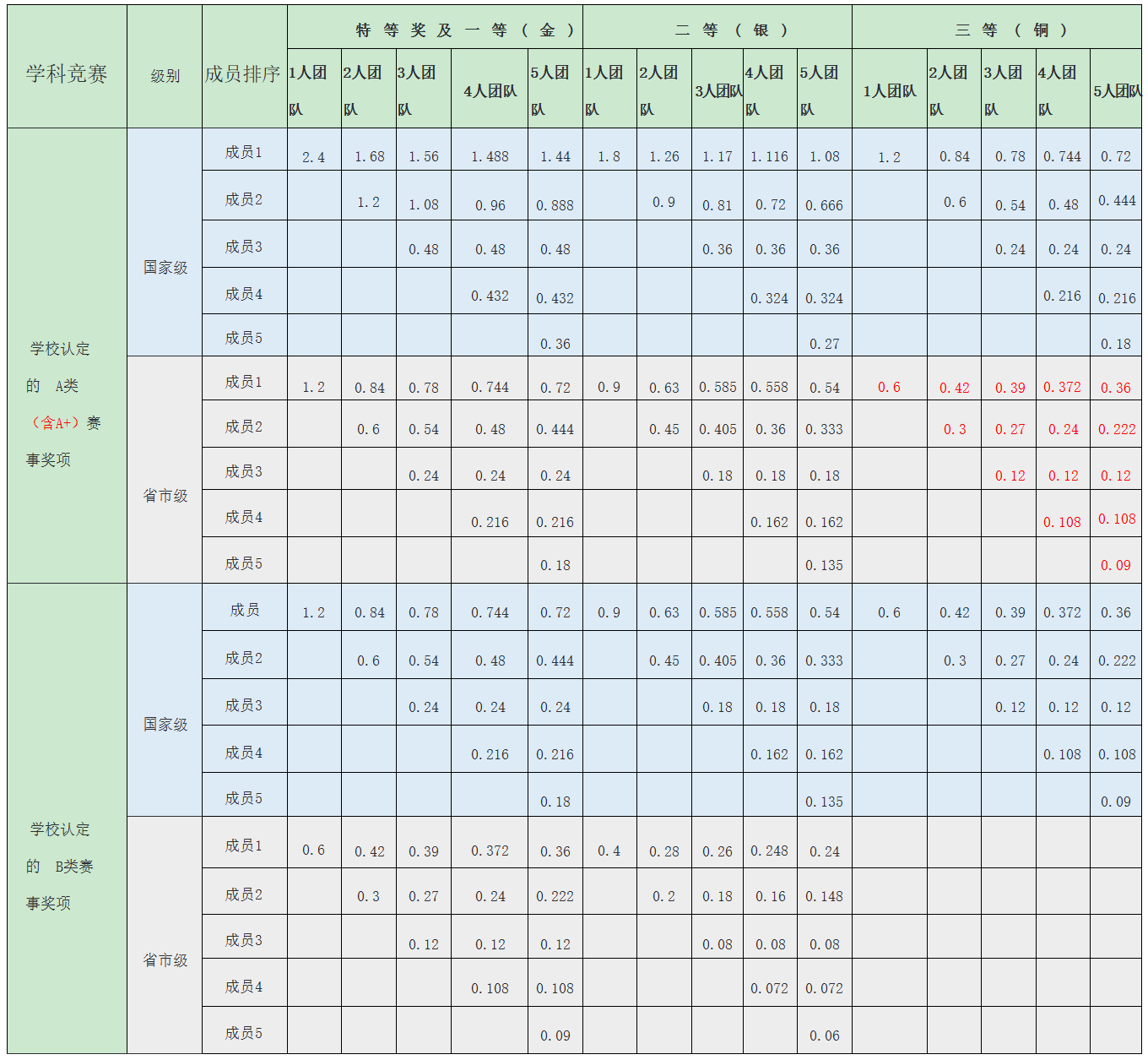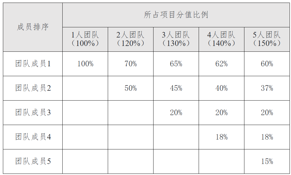 ④以团队获得奖励荣誉的,按照贡献度依次计算绩点,各成员绩点分配比例见附表3。
