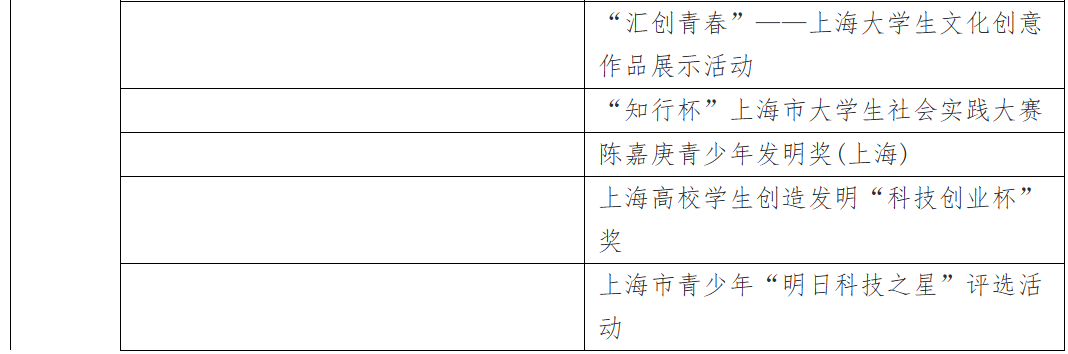 (2)全国大学生创新创业年会“优秀学术论文、我最喜爱的项目、最佳创意/创业项目”可计为一等奖,入选项目计为三等奖;上海大学生创新创业训练计划成果展“我最喜爱的项目、最佳创新/创业项目报告、最佳创新创业训练计划项目案例”可计为一等奖,“优秀创新/创业项目报告、最佳人气项目奖、优秀创新创业训练计划项目案例”计为三等奖。