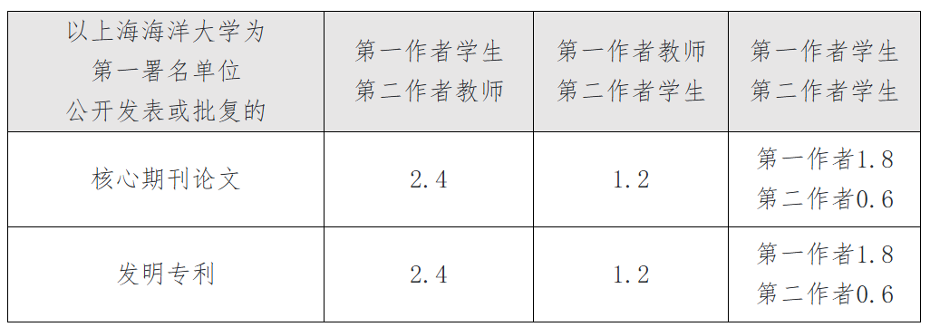 在国内外核心期刊上已公开发表与专业相关的,且第一署名单位为上海海洋大学的学术论文(只计算前两位作者),每项最高计为2.4绩点。发表人顺序及绩点计算见附表1。