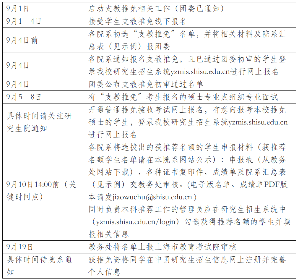 7. 校团委、教务处审核各院系报送的研究生支教团推免候选人资格。“支教推免”操作办法见《上海外国语大学第28届研究生支教团招募选拔实施细则》。