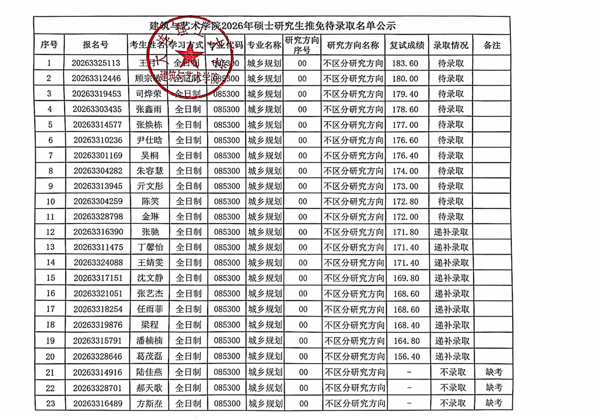 建筑与艺术学院2026年硕士研究生推免待录取名单公示