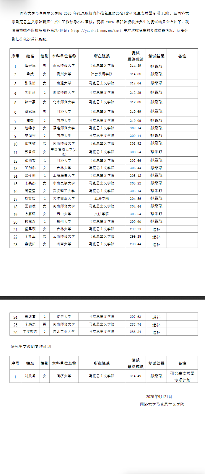 同济大学马克思主义学院2026年推免生复试成绩公示