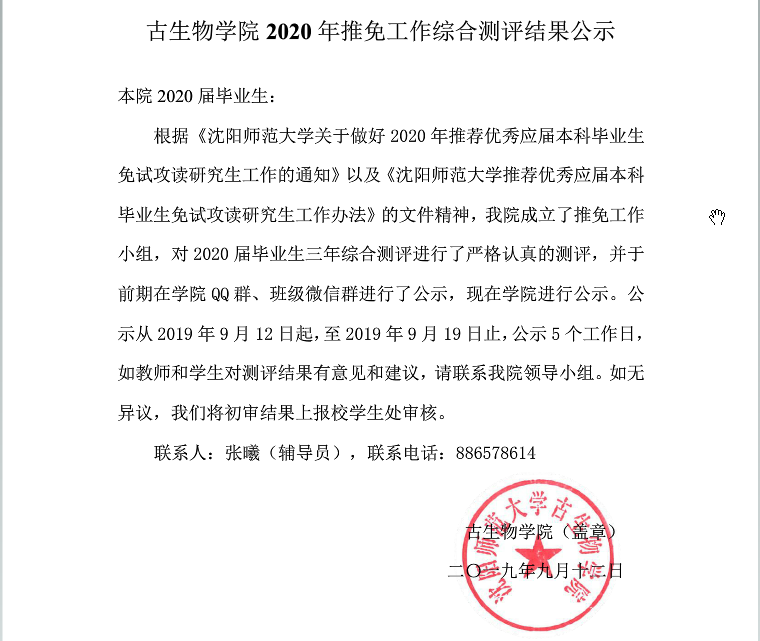 沈阳师范大学2020年古生物学院推免工作综合测评结果公示