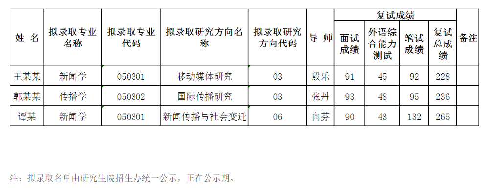 中国社会科学院大学新闻系2019年招收推免生复试结果