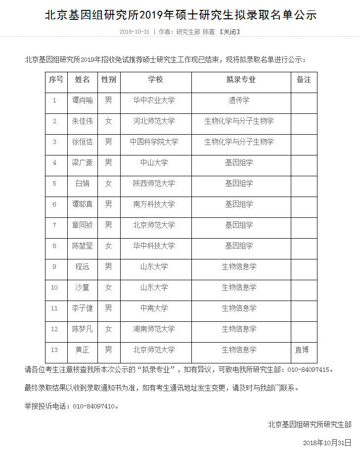 中国科学院大学北京基因组研究所2019年推荐免试硕士研究生拟录取名单公示