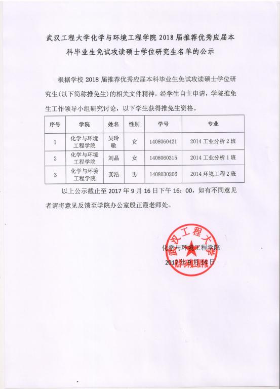 武汉工程大学化学与环境工程学院2018届推荐优秀应届本科毕业生面试攻读硕士学位研究生名单公示