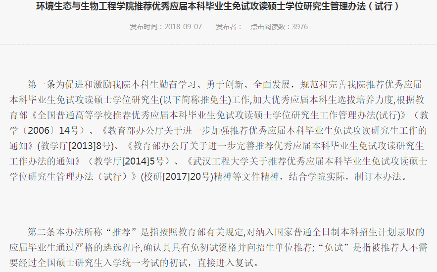 武汉工程大学2018年环境生态与生物工程学院推荐优秀应届本科毕业生免试攻读硕士学位研究生管理办法(试行)