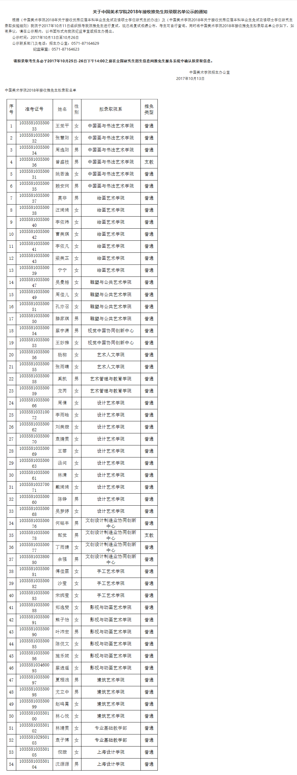 中国美术学院2018年接收推免生拟录取名单公示的通知-招生信息
