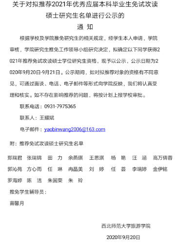 关于对拟推荐2021年优秀应届本科毕业生免试攻读硕士研究生名单的公示