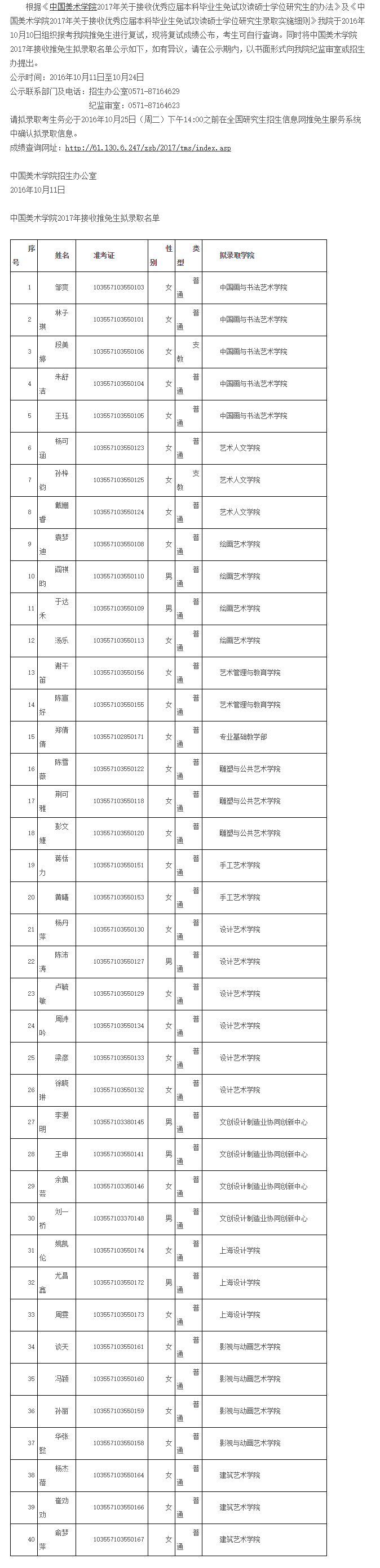 中国美院2017年接收推免生复试成绩查询及拟录取名单