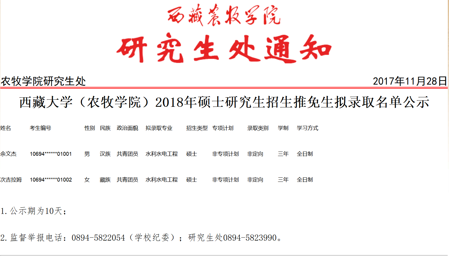 西藏大学(农牧学院)2018年硕士研究生招生推免生拟录取名单公示