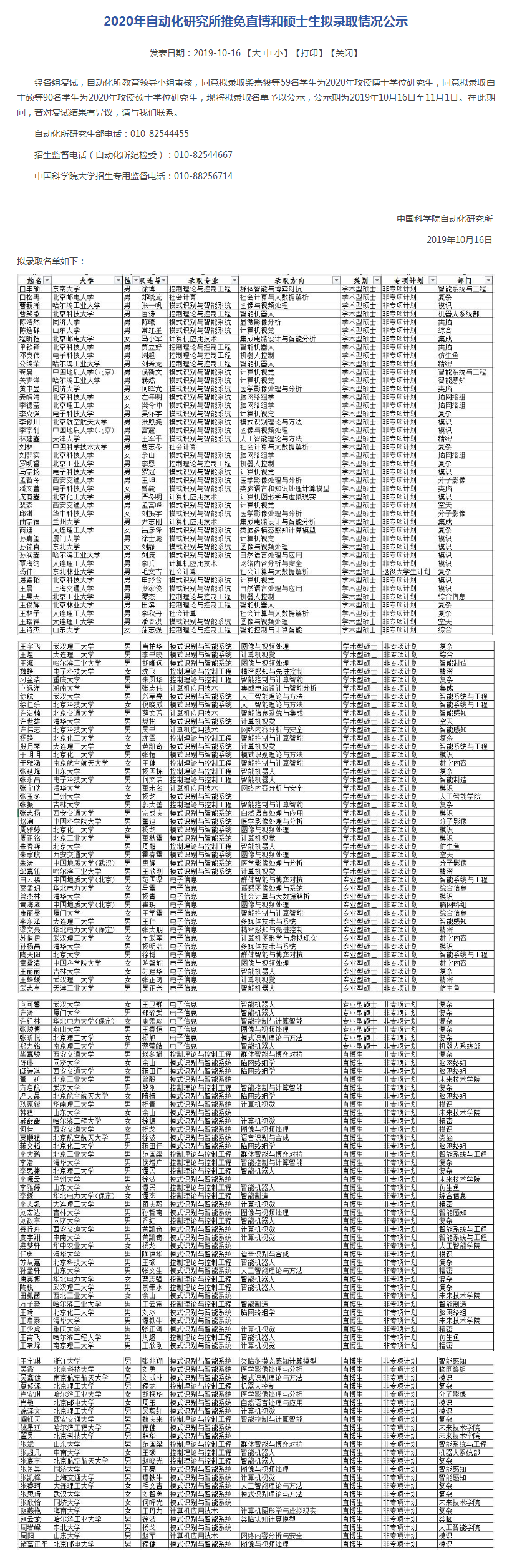 中国科学院大学2020年自动化研究所推免直博和硕士生拟录取情况公示