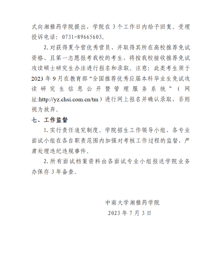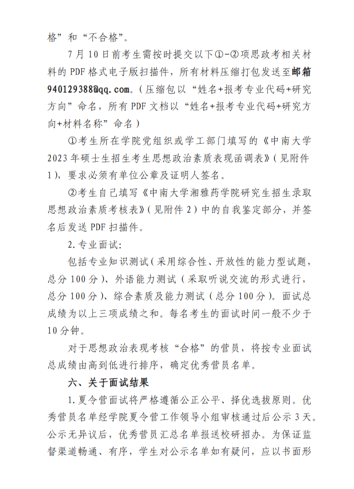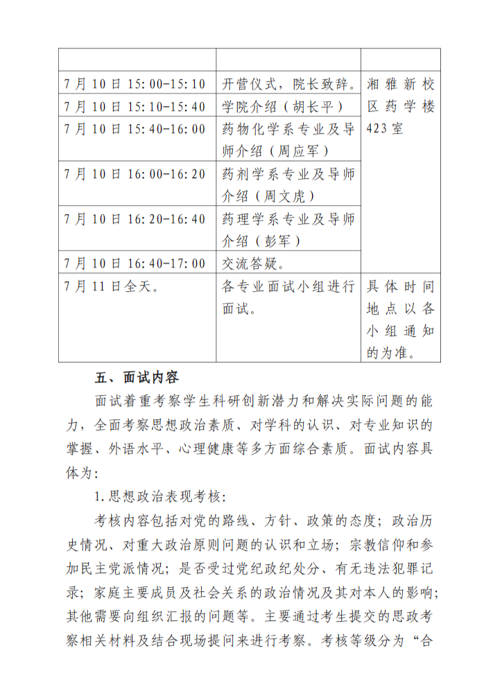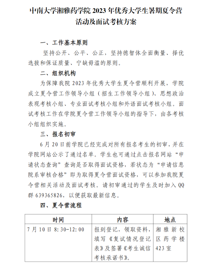 中南大学湘雅药学院2023年优秀大学生暑期夏令营活动及面试考核方案