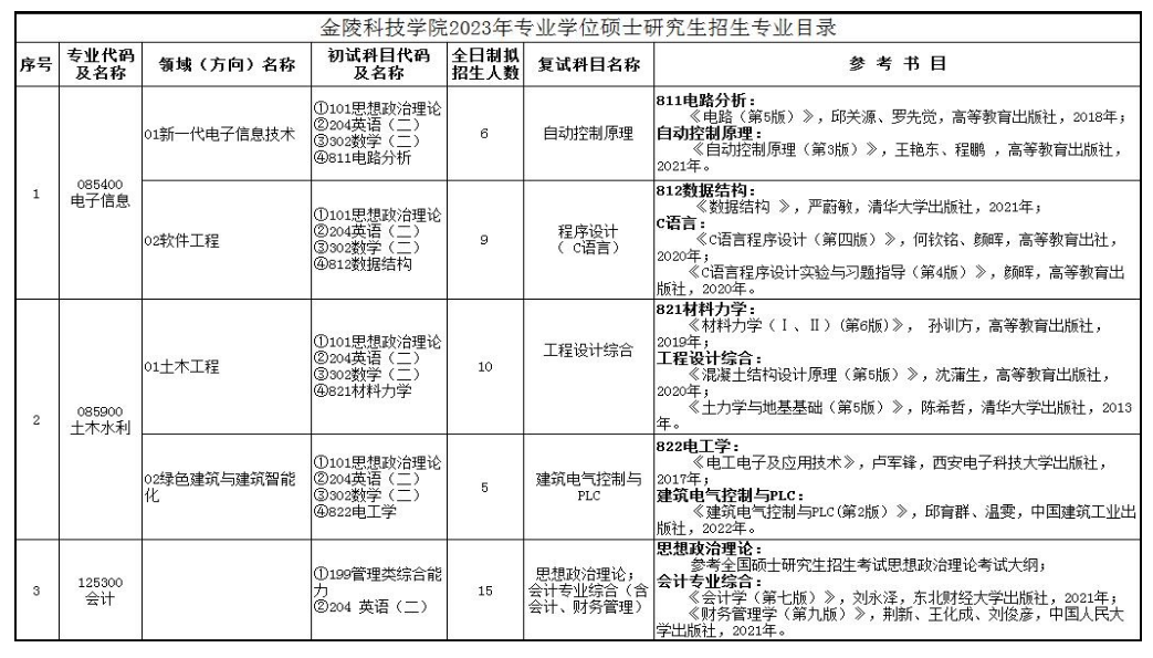 金陵科技学院2023年专业学位硕士研究生考试参考书目