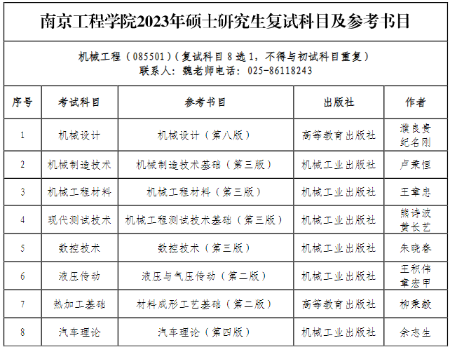 中国北方车辆研究所2023年硕士研究生招生考试复试参考书目