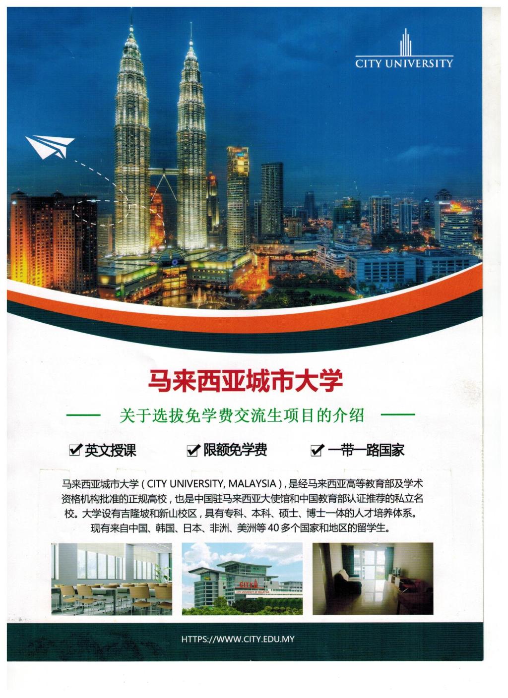 各单位: 一、大学介绍 1. 城市大学 马来西亚城市大学(City University, Malaysia)是经马来西亚高等教育部及学术资格机构批准的正规高校,也是中国驻马来西亚大使馆和中国教育部认证推荐的私立名校。大学设有吉隆坡和新山校区,具有专科、本科、硕士、博士一体的人才培养体系。现有来自中国、韩国、日本、非洲、美洲等40多个国家和地区的留学生。 2. 吉隆坡大学 吉隆坡大学(Universiti Kuala Lumpur,简称UniKL) 是马来西亚卓越的工程技术私立大学,是经马来西亚高等教育部及学术资格机构(MQA)批准的正规高校,是首批获得中国教育部涉外监管网推荐认证的大学之一。UniKL目前于马来西亚半岛各地设有12个校区,共开办131门课程,是一所具有完整的学士、硕士、博士人才培养体系的国际性高等院校。 二、项目内容 专业课程均为英文授课,学校为中国学生提供中文课外辅导教师。 三、申请条件 申请参加项目的学生首先以自觉自愿为前提,同时必须符合以下申请条件: 四、报名材料及申请程序 1. 学生向所在学院提交赴国外学习交流书面申请,经所在学院审核后填写推荐意见并加盖公章; 五、学分管理 1. 课程选修原则 六、材料报送 请于10月28日17:00前将材料报送至 行政楼424办公室。 联系人:刁丽娜 电话:6392699