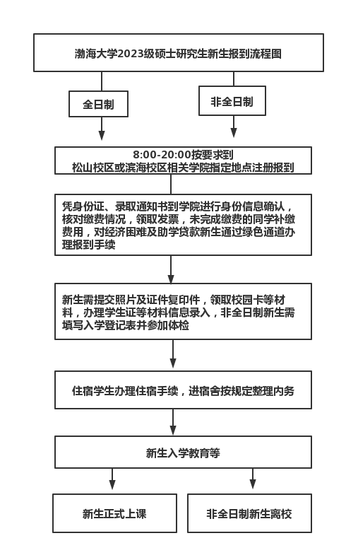 报到流程:新生报到时,松山校区新生到图书馆北广场接待处,滨海校区新生到宿舍区南侧甬路接待处办理入学手续。办理时,请携带录取通知书、身份证、手机等进入报到区域。学校将通过人脸识别确认新生身份,请勿浓妆艳抹。新生办理入学手续时,请家长到等候区休息,不要进入报到区域。
