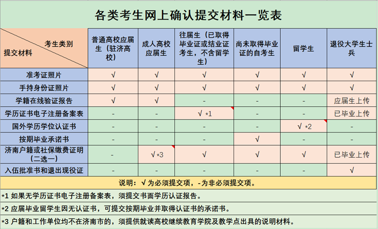 (二)工作或户籍在济南市的其他考生(含往届生、成人高校应届生、尚未取得毕业证的自考生、留学生)。网上确认时,济南市户籍的其他考生需提供户口本首页、索引页及个人单页(集体户口仅提供首页及个人单页);在济南市工作的其他考生需提供至少包含2025年8、9、10三个月的社保缴纳证明(该凭证页面上的验证码及查验流水号必须清晰)。户籍和工作证明,二者具一即可。