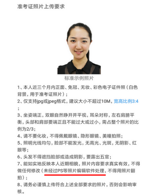 说明:如遇到身份证核验未通过,考点审核时会要求考生提供身份证照片补充材料(有效居民身份证人像面、身份证国徽面;照片要求身份证边框完整,字迹清晰可见,亮度均匀);如遇到报名时证件类型非居民身份证的,考点审核时会要求考生提供本人有效证件。