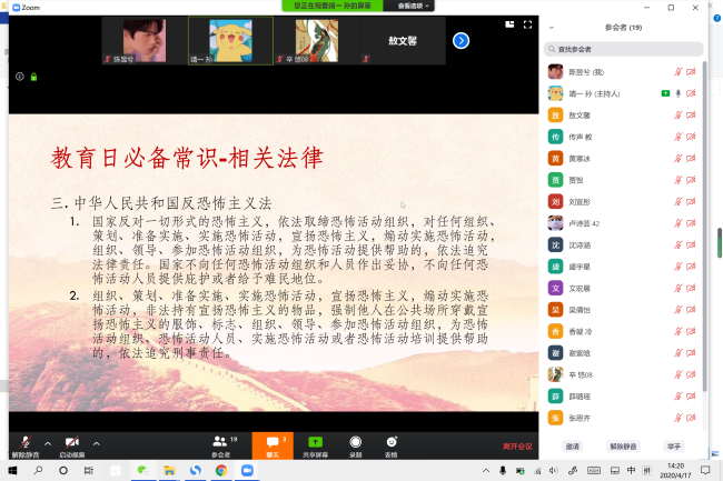 2020年4月15日至18日,英语系学生党支部、英语系大一至大四共16个团支部陆续开展了2020年全民国家安全教育日学习活动。围绕“坚持总体国家安全观,统筹传统安全和非传统安全,为决胜全面建成小康社会提供坚强保障”的主题,各支部根据实际情况,在企业微信、Zoom、腾讯会议等网络平台开展了线上学习会,观看总体国家安全观公益宣传片,学习由中国大学生在线举办的国家安全教育日公开课并参加全国大学生国家安全教育知识竞赛。