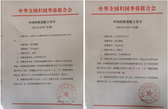 新冠肺炎疫情肆虐的时期,也是各类科研项目申报的高峰时期。团队成员在申报项目方面不放松、不停顿,采用多种方法助推科研项目的申报与论证。张秋生教授的“江苏华侨华人史”获批中国侨联2019-2021年度重点课题,朱锦程副教授的“马来西亚华裔青少年文化记忆的‘一体两翼’驱动机制研究”获批一般课题,赵昌博士的“民粹主义对澳洲华侨华人权益的影响及其应对研究”获批中国侨联青年课题。邵政达副教授和赵昌博士完成了今年国家社科基金的申报工作。同时,为了配合学校2020年的中心工作,团队还在张秋生教授的带领下,完成了“国家民委区域国别研究平台”申报论证及支撑材料编写,为将来进一步提高科研水平、促进高水平成果培育、加强创新团队培养指明了新的方向。