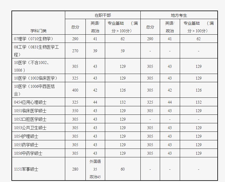 2019年海军军医大学全国硕士研究生招生考试进入复试的初试成绩基本要求