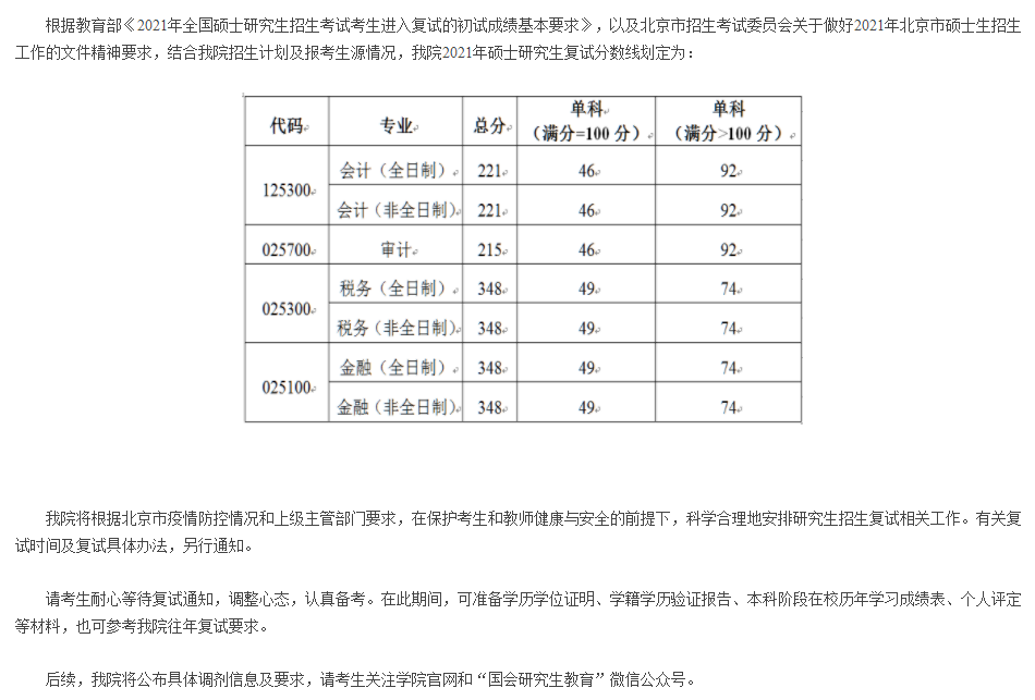北京国家会计学院2021年硕士研究生招生复试基本分数线