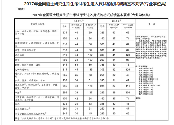 学校执行2017年全国硕士研究生统一入学考试进入复试的初试成绩基本要求;报考“退役大学生士兵专项硕士研究生招生计划”的考生进入复试的初试成绩要求为:学术型硕士研究生总分不低于235分;专业学位硕士研究生总分不低于200分,管理类联考总分不低于120分。