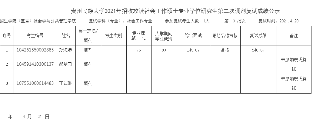 贵州民族大学2021年招收攻读社会工作硕士专业学位研究生第二次调剂复试成绩公示