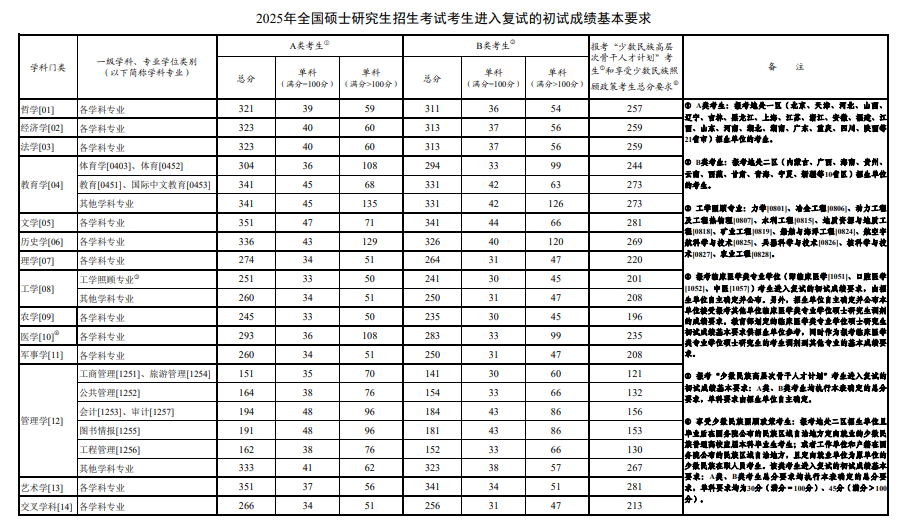 2025年全国硕士研究生招生考试考生进入复试的初试成绩基本要求