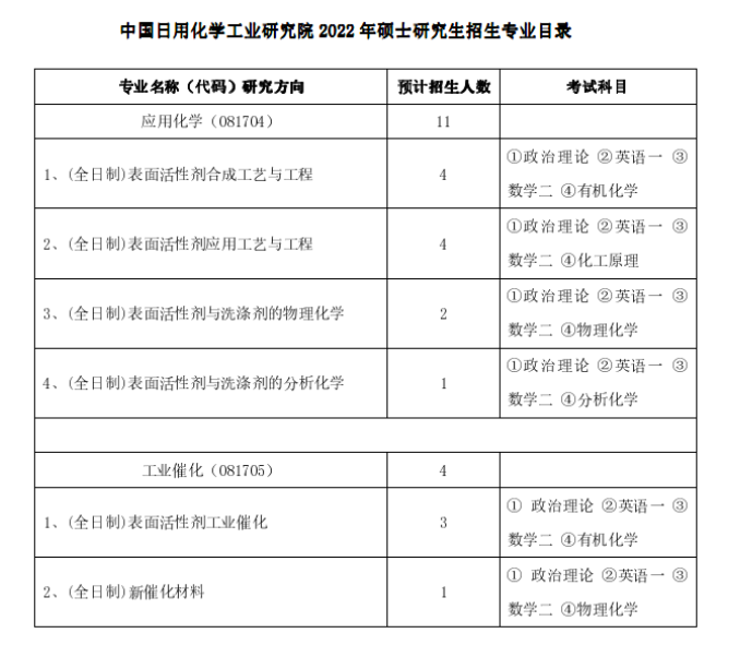中国日用化学工业研究院2022年硕士研究生招生专业目录