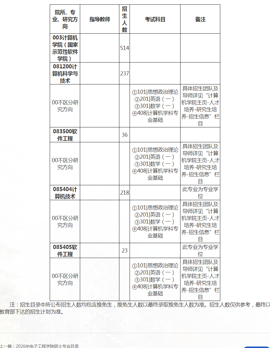 北京邮电大学 2026年计算机学院(国家示范性软件学院)硕士专业目录