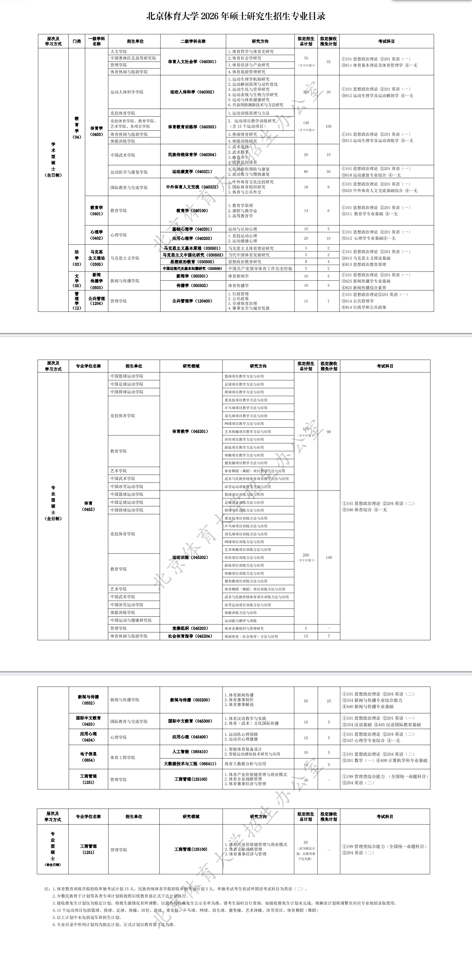 北京体育大学2026年硕士研究生招生专业目录