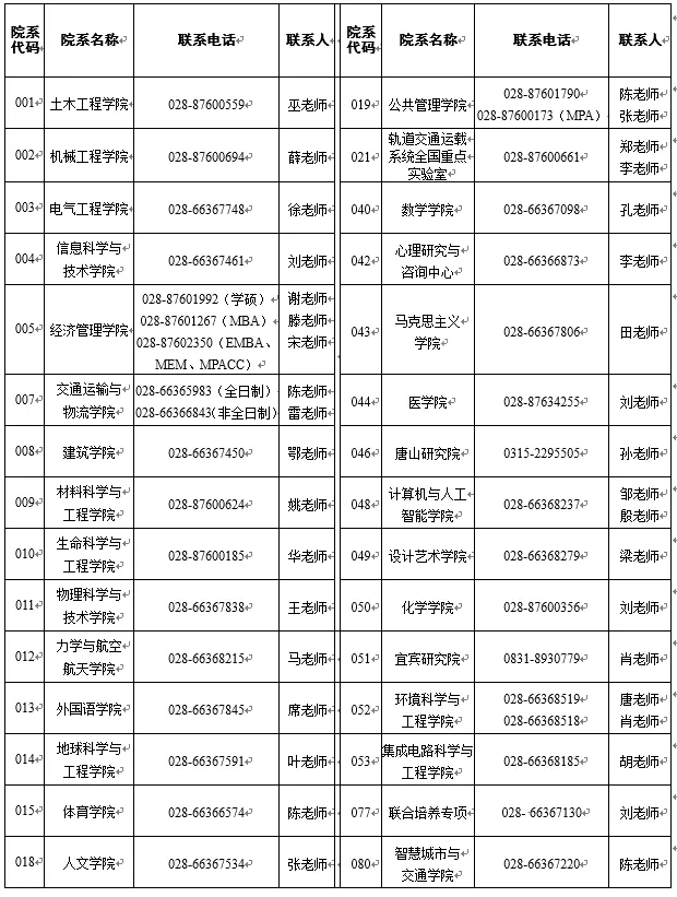 西南交通大学2025年硕士研究生招生院系联系