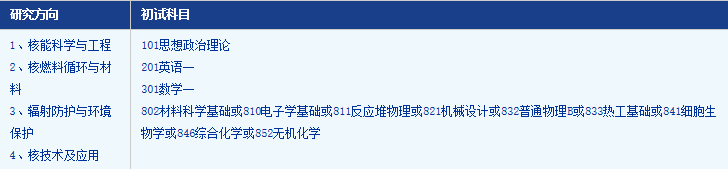 3、“辐射防护与环境科学保护”:培养目标是为保障核行业及核科学与技术在生命、环境、安全等相关领域应用提供高素质科研、设计和管理的专门人才,开展中子物理与核安全、辐射防护与环保、放射化学等专业方向的科学研究与研究生教育。