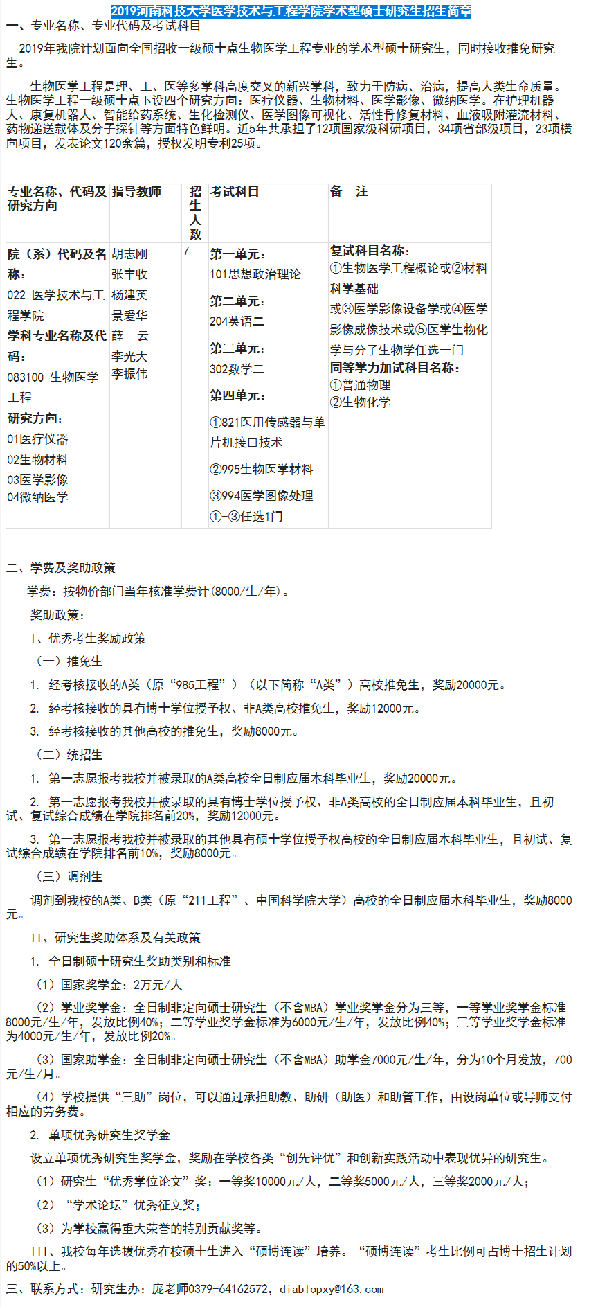 2019河南科技大学医学技术与工程学院学术型硕士研究生招生简章